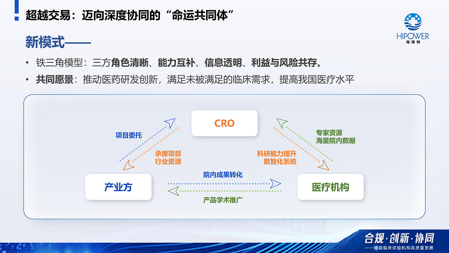 在王帅帅董事长的分享中,她指出,CRO已从传统的“项目承接方”逐步升级为申办方与医疗机构之间的“战略协同伙伴”。