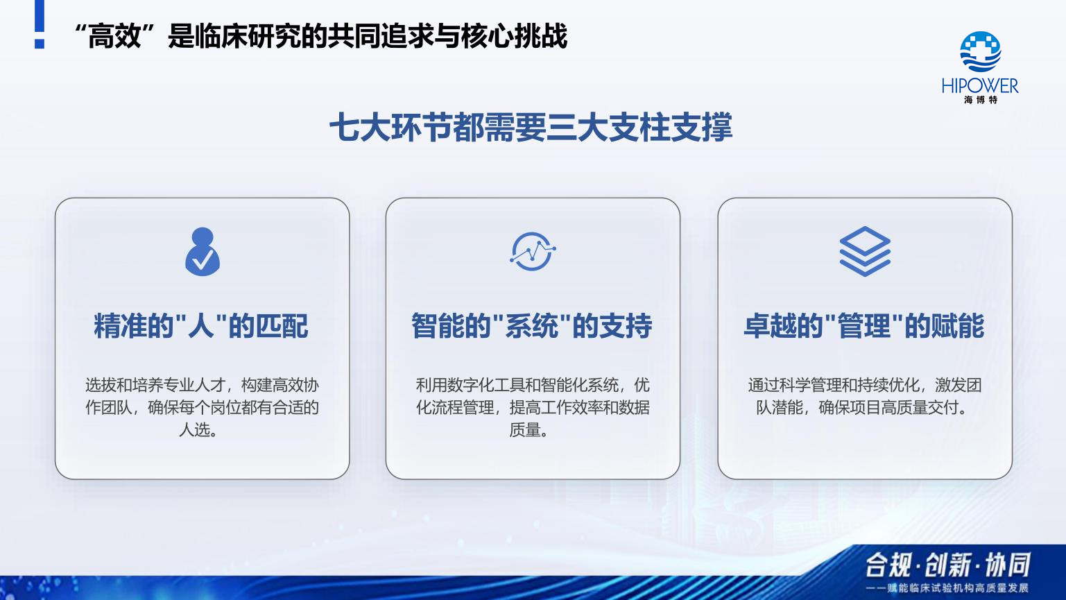 王帅帅董事长强调,“高效”是临床研究的共同追求,而实现高效离不开三大支柱的体系化建设,包括精准的“人”的匹配,智能的“系统”的支持,以及卓越的“管理”的赋能。