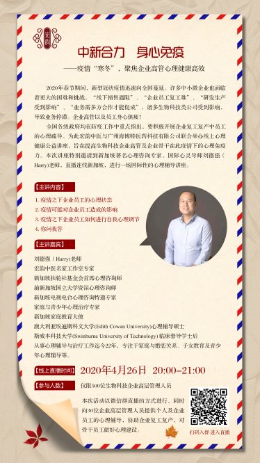 全国各级政府均在防疫工作中重点指出,要积极开展企业复工复产中员工的心理疏导。为此宏韵中医与广州海博特医药科技有限公司联合举办线上心理健康公益讲座,旨在提高生物科技企业高管及企业骨干在此疫情下的心理免疫力。本次讲座特别邀请到新加坡著名心理咨询专家、国际心灵导师刘德强(Harry)老师,直播连线新加坡,进行-场国际性的心理辅导讲座。