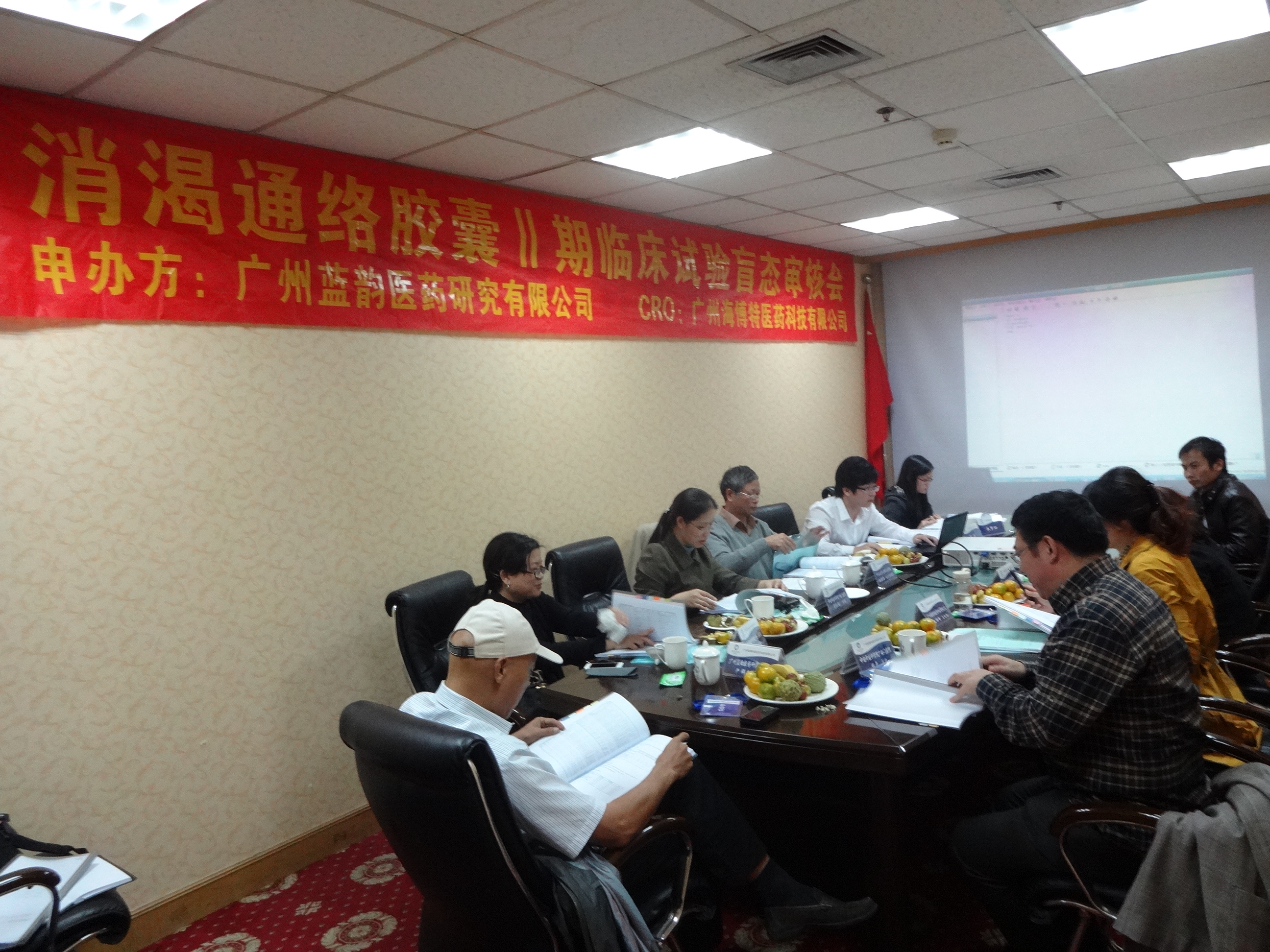 2013年10月15日消渴通络胶囊治疗2型糖尿病周围神经病变II期临床试验盲态审核会在北京广安宾馆顺利召开。会议由广州海博特医药科技有限公司组织,邀请到组长单位中国中医科学院广安门医院内分科主要研究者和临床试验机构办主任及老师、统计单位中山大学公共卫生学院统计专家及申办方广州蓝韵医药研究有限公司领导参加本次会议。