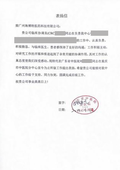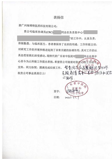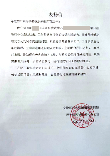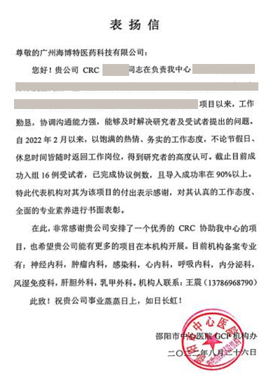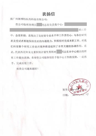 11月11日,海博特收到了来自广东省中医院、西北妇女儿童医院等两家研究机构发来的表扬信,信中表达了对我司CRC认真负责、勤恳积极的工作态度的肯定,并就共同推进项目进展对我司寄以殷切希冀。