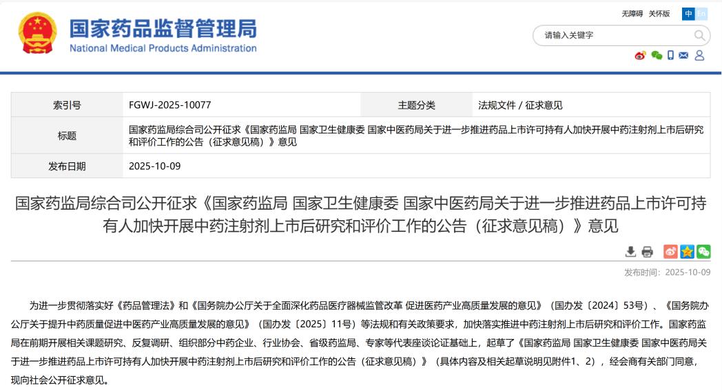 10月9日,国家药监局 国家卫生健康委 国家中医药局发布《关于进一步推进药品上市许可持有人加快开展中药注射剂上市后研究和评价工作的公告(征求意见稿)》,向社会公开征求意见。