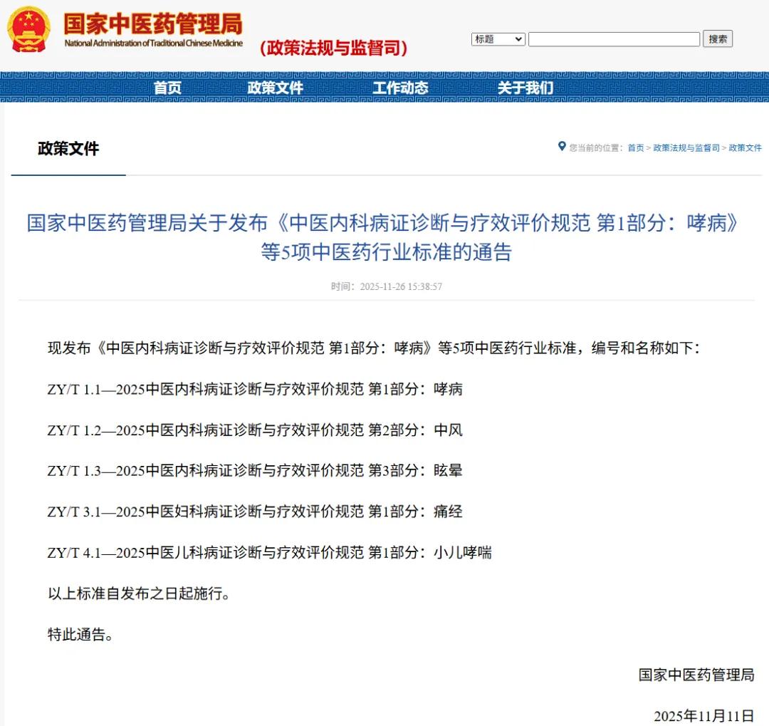国家中医药管理局现发布《中医内科病证诊断与疗效评价规范 第1部分:哮病》等5项中医药行业标准,编号和名称如下: