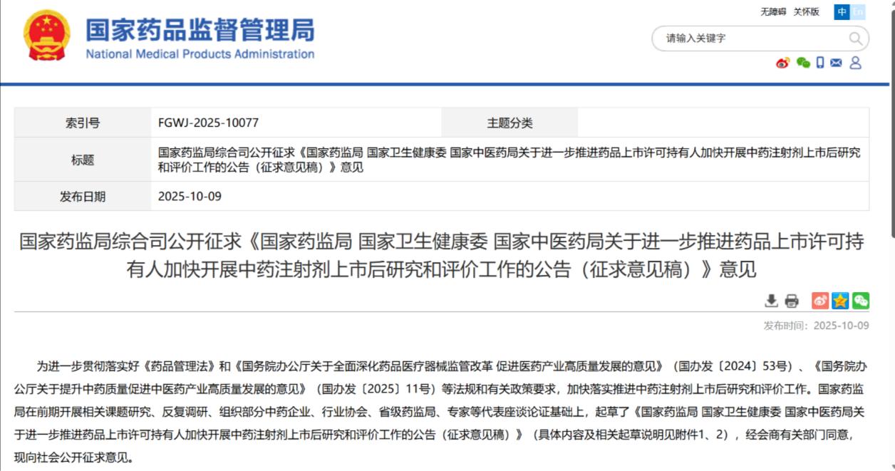 1、国家药监局综合司在2025年10月9日发布的《国家药监局 国家卫生健康委 国家中医药局关于进一步推进药品上市许可持有人加快开展中药注射剂上市后研究和评价工作的公告(征求意见稿)》,https://www.nmpa.gov.cn/xxgk/zhqyj/zhqyjyp/20251009154922152.html?sessionid=