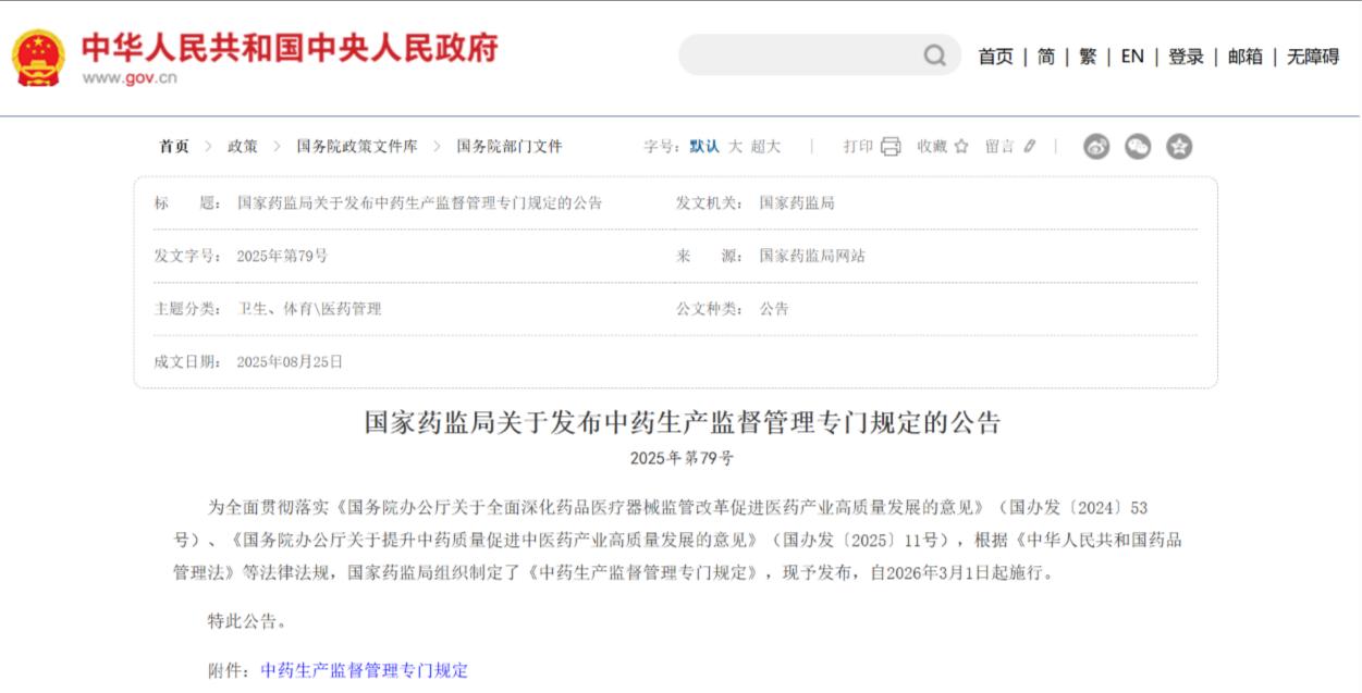 2、国家药监局关于发布中药生产监督管理专门规定的公告,https://www.gov.cn/zhengce/zhengceku/202509/content_7039746.htm