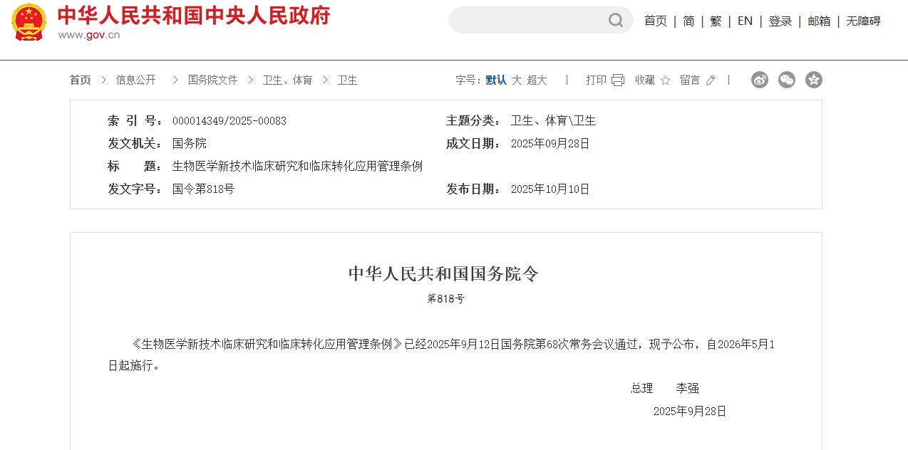 当时间的指针即将指向2026 年 5 月 1 日,整个生物医药行业都在屏息等待一个历史性时刻 ——国务院第 818 号令(《生物医学新技术临床研究和临床转化应用管理条例》)的正式施行。这不仅是一份法规的落地,更是中国临床研究从 "野蛮生长" 迈向法治化、规范化、高质量发展的分水岭,也为身处产业核心的 CRO(合同研究组织)与临床研究从业者,打开了前所未有的机遇之门。