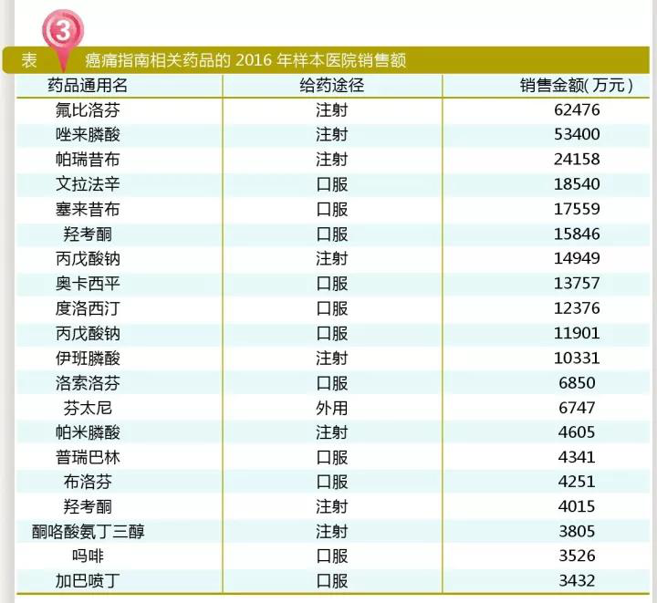 从2017年医保目录西药部分可见,癌痛指南中常见的癌痛用药被限制使用的剂型主要是注射剂和贴剂,口服缓释剂和缓控释的限用较少。癌痛用药最常用的是口服给药,其次可选用贴剂或肛门栓。由于易耐药、镇痛时间短、副作用大等弊端,注射剂在癌痛治疗中其实并不是主流提倡药物,仅不宜口服者才考虑注射。