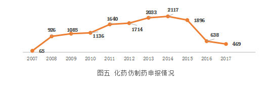 我国仿制药申报注册自2007~2017年经历了底谷和高峰。从数据上看,2014年前后达到高峰,化药仿制药的申报受理号达到了2117个,随着化学药品注册分类改革的推进,到2017年降至469个受理号(注:这里统计的化药包含新注册分类中3、4类,以及部分少量按旧注册分类6类的化药仿制药)。其中,新4类仿制药为236个,从侧面反映出我国仿制药水平正朝着良性发展,企业把目光更多地投向创新药和高水平的仿制药上。(见图5)